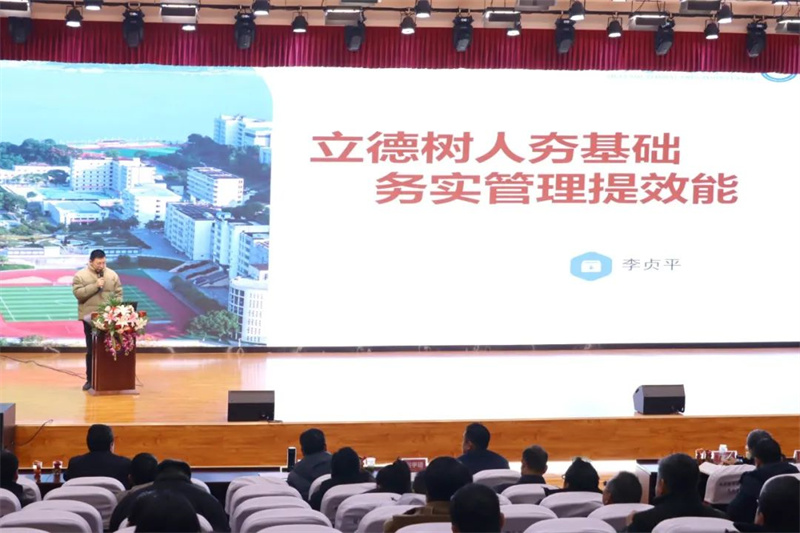 回望是一种姿态,总结过去、反思成长,寒风虽劲却难掩教育的满腔热忱。为了增强教职工凝聚力,推动学校各项工作高效、有序开展,促进教育教学的高质量发展,1月3日下午,学校召开2025年首次教师大会,现代教育集团副董事长朱宗桥、校长吴昌钧、督学李朝晖、副校长肖飞、副校长伍远明、后勤保障部副部长龚红艳出席本次会议,学校全体教职工参加会议。