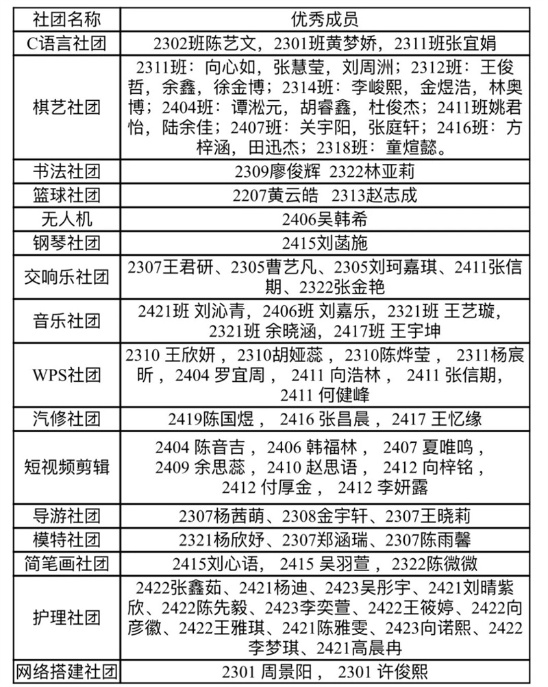 本次社团活动结课考核,学校特意邀请了社团教师担任特邀评委。他们认真观看每一个社团的展演,仔细欣赏每一个节目的演绎,对同学们的表现给予了高度评价,并评选出了一批优秀社团成员,名单如下:
