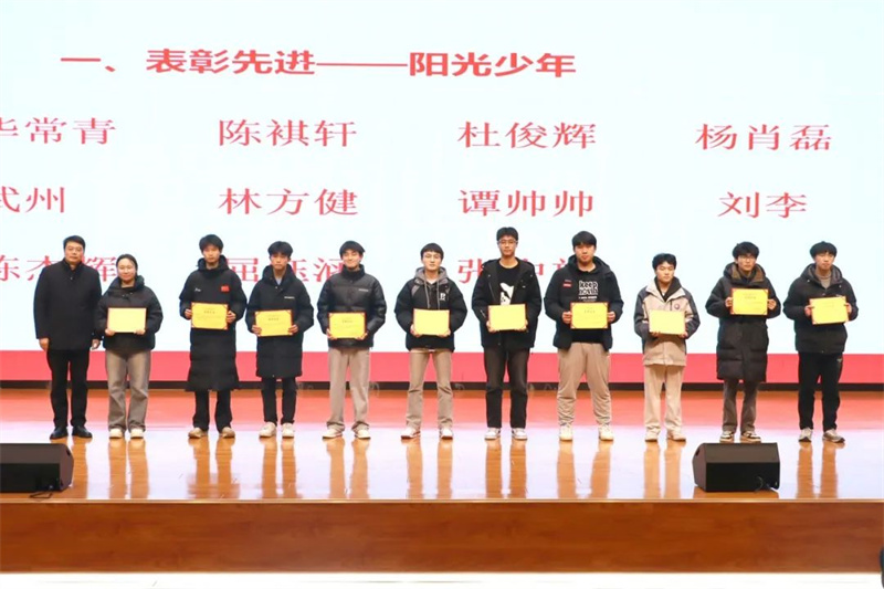 大会在同学们嘹亮的国歌声中拉开帷幕。在表彰环节,毕常青、陈祺轩、杜俊辉、杨肖磊、武州、林方健、谭帅帅等12名同学获得“阳光少年”称号,吴昌钧校长为他们颁奖;随后,伍远明校长、谢华军主任、沈恒宇老师为学习标兵颁奖,同时,给予他们肯定与鼓励,希望能再接再厉,更上一层楼!