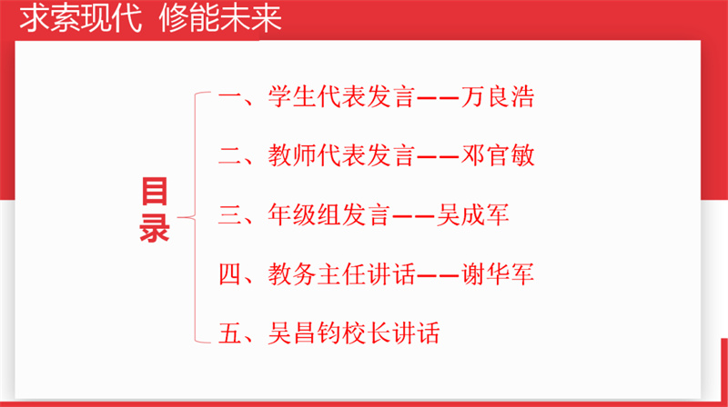 唯有努力攀登,方能屹立于顶峰。为进一步激发全体同学的学习热情和动力,以更加饱满的精神状态投入到接下来的学习生活中,11月11日,高三师生在报告厅召开11月训导大会,校长吴昌钧、课程发展处主任谢华军、年级主任吴成军出席此次会议。