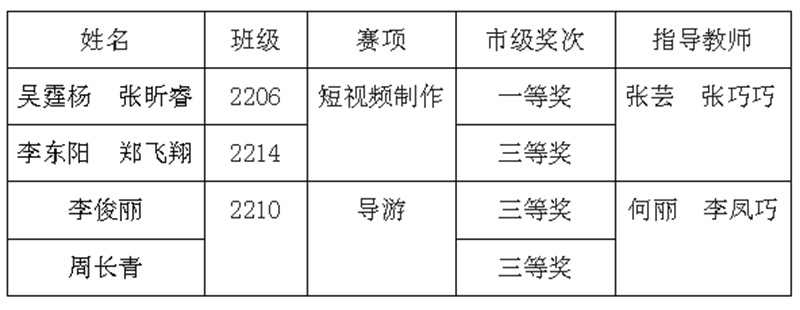 经过激烈的比拼与专业的评审,一系列优秀作品与选手脱颖而出,我校6名参赛选手全员获奖。其中,短视频制作赛项一、三等奖各一组,导游赛项三等奖两人。
