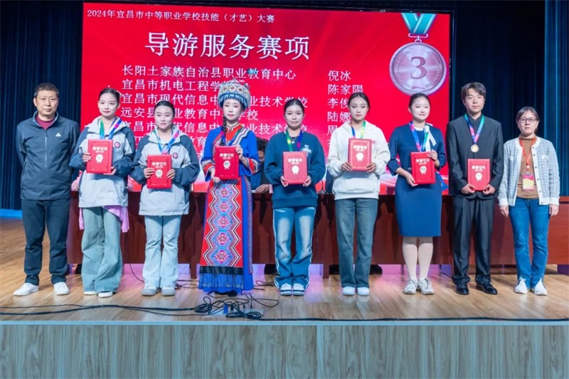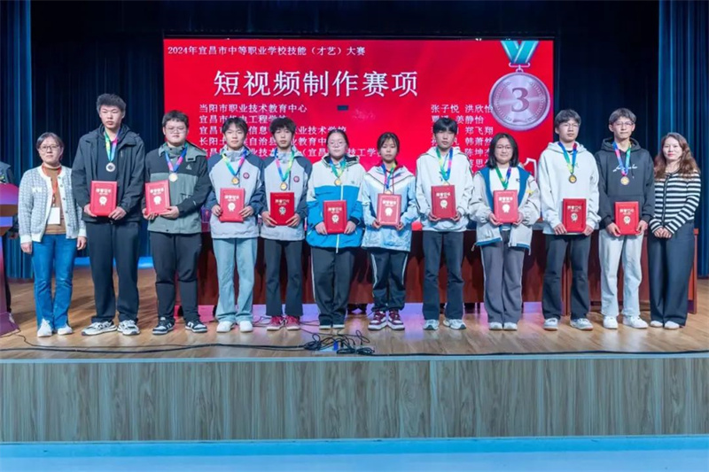 8.在10月至11月举行的宜昌市职业院校学生技能大赛中,学校有序组织,教师精心指导,学生获得短视频制作一等奖、三等奖,导游服务三等奖,办公软件综合应用一等奖、三等奖,C语言三等奖。