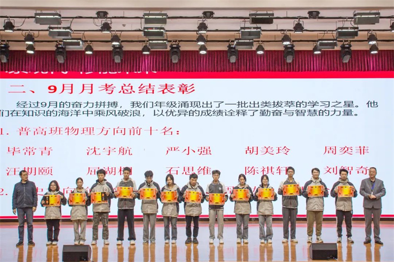 大会对9月月考中表现优异的高三学子进行了表彰。督学李朝晖、副校长伍远明、课程发展处主任谢华军、高三年级主任吴成军为获奖同学颁奖,并向他们表示热烈的祝贺。获奖同学脸上洋溢着自豪的笑容,他们的成绩不仅是个人努力的结果,更是对全体高三学子的一种激励。校领导希望全体同学能以他们为榜样,继续发扬勤奋学习、勇于拼搏的精神,为实现自己的梦想而努力奋斗。