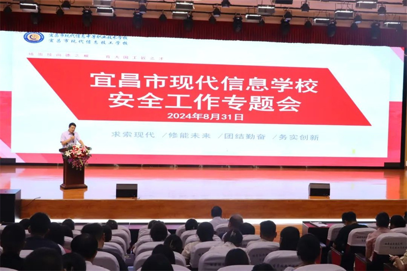 安全无小事,预防是关键。为扎实做好2024年秋季学期学校安全工作,8月27日上午,宜昌市现代信息学校召开秋季学期开学前安全工作部署会议,现代教育集团董事长、党支部书记田水荣及校长吴昌钧、督学李朝晖、副校长肖飞、副校长伍远明出席会议,各部门主要负责人参会。