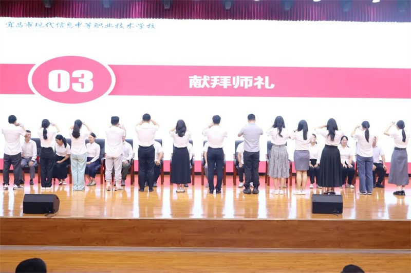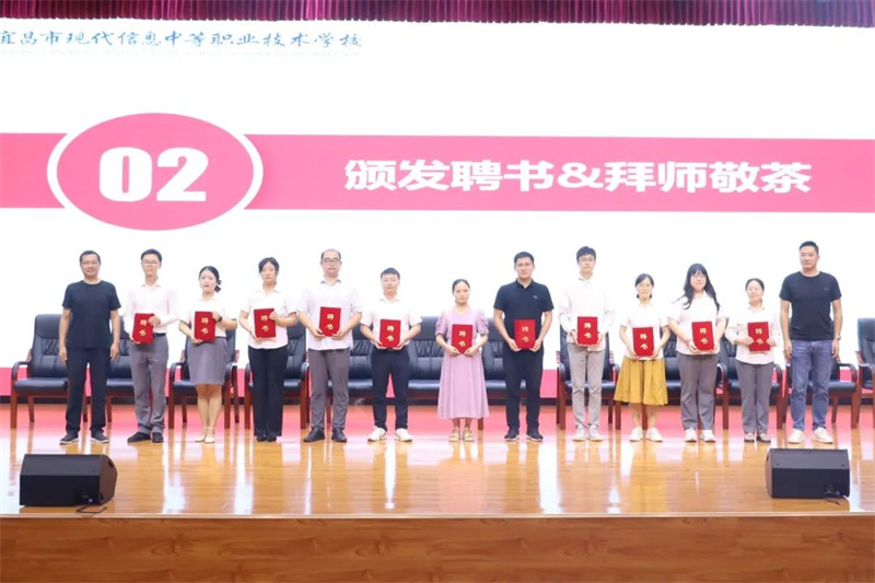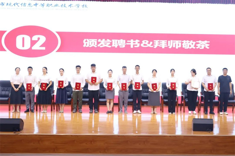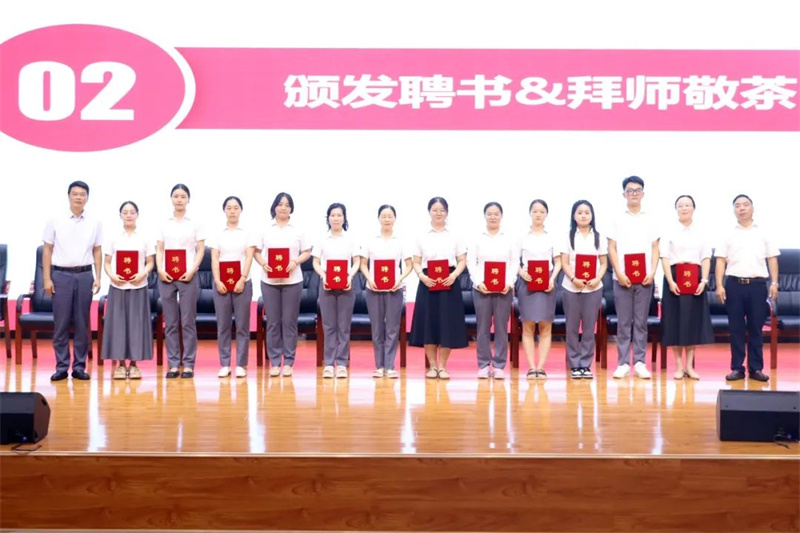 校领导向各位师傅颁发聘书,徒弟拜师敬茶。一张聘书、一句师傅,是荣誉、是信任,更是责任。它搭建起了薪火相传的桥梁,承载着师徒之间的深厚情谊。