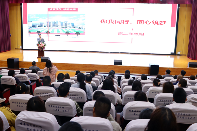 大会伊始,高二年级主任吴成军向家长朋友们表示了热烈欢迎和诚挚感谢,并以视频形式分享了学生在校期间学习生活的点点滴滴,既展现了他们成长的侧影,又投射出了现代人“用心做教育,用爱做人师”的剪影。交流教育经验的同时,从总结回顾、立足现状、展望未来三方面对目前的学期工作进行了汇报。通过与家长们的良好互动,他表达了家校携手,共育英才,为孩子的未来添砖加瓦的美好愿景。