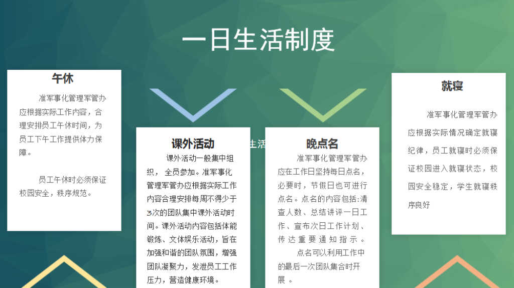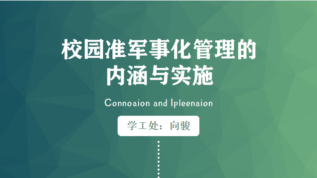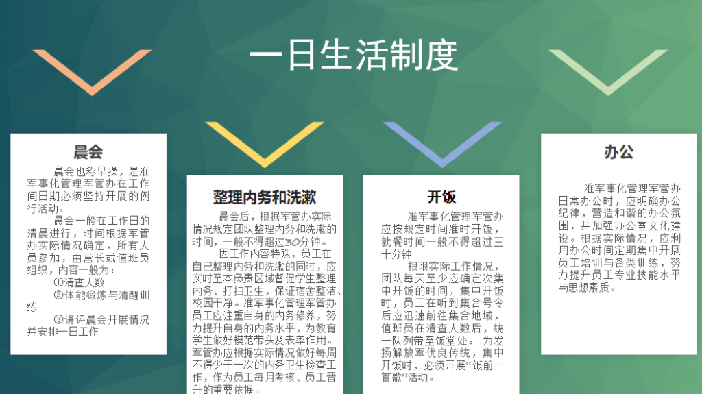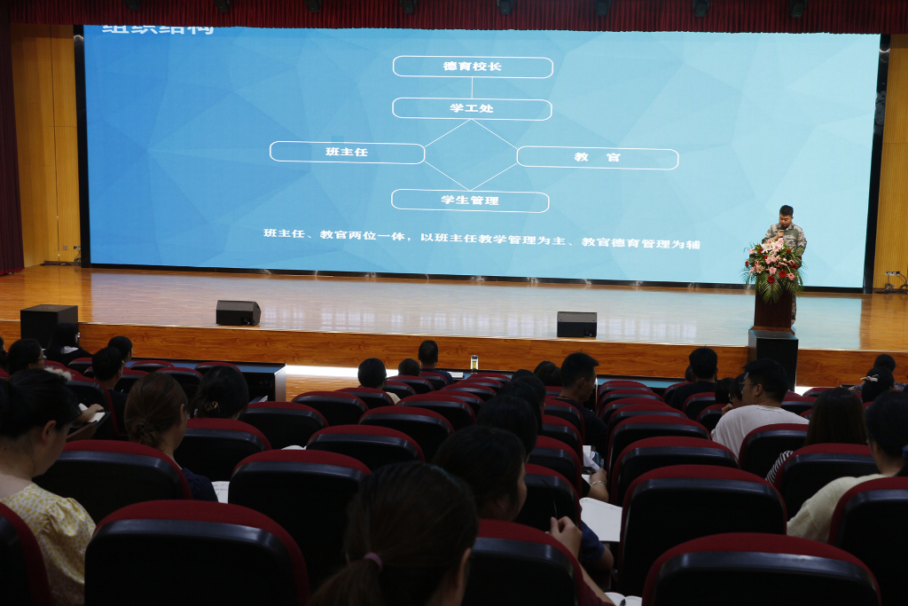 学生发展处副主任向骏从连队管理主要工作、一日生活制度、日常会务三方面介绍了我校准军事化管理的内涵和实施方案。启动军事化管理制度,把部队中的好作风、好思想、好经验、好传统通过实践有效地融入到学校的管理当中,也为学校创新发展建设和谐校园,提供有力保障。