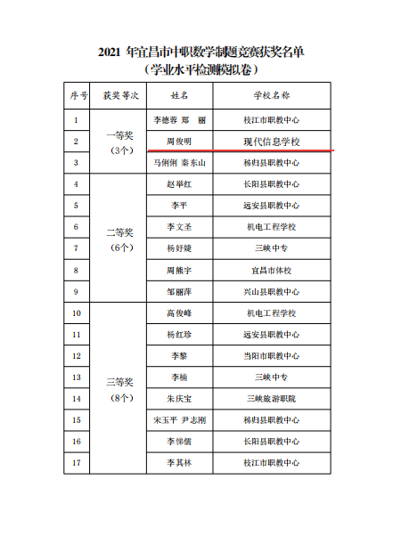 热烈祝贺周俊明老师获宜昌市中职数学技能高考模拟卷制题竞赛二等奖。