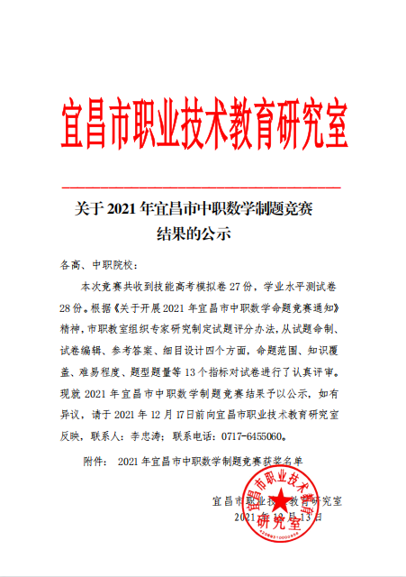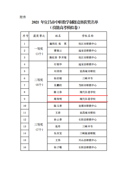 12月13日,2021年宜昌市中职数学命题竞赛评审结果予以公示,我校周俊明老师在学业水平检测模拟卷竞赛中获一等奖,陈文春、周俊明老师在技能高考模拟卷竞赛中分获二等奖。