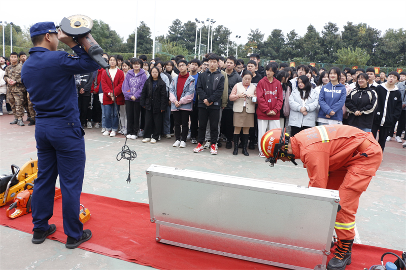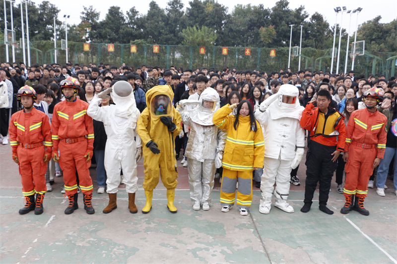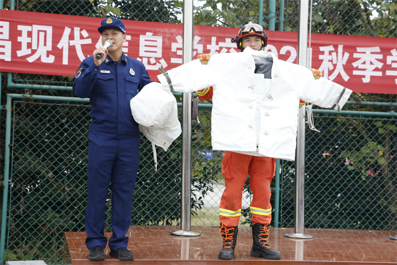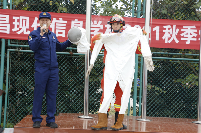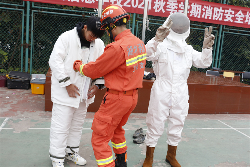 猇亭区消防大队陈警官详细讲解了生活中常见的灭火原则以及灭火器材的使用方法。同时,为学生展示了防火隔热服、防毒面具等消防设备,陈教官的讲解风趣幽默又详细具体,学生们热情高涨,穿上厚重的消防服,体会到了消防员的艰辛与不易,更深刻的认识到消防安全的重要性。