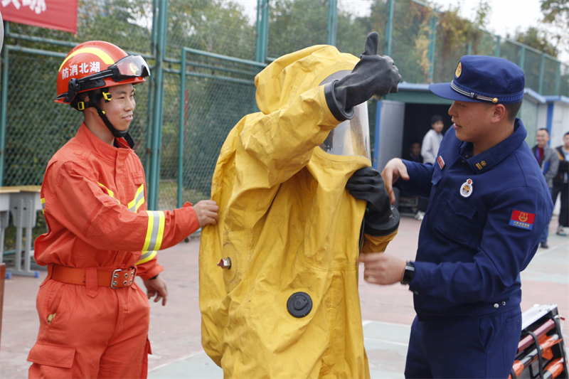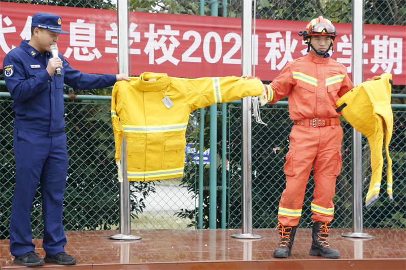 学生试穿消防服
