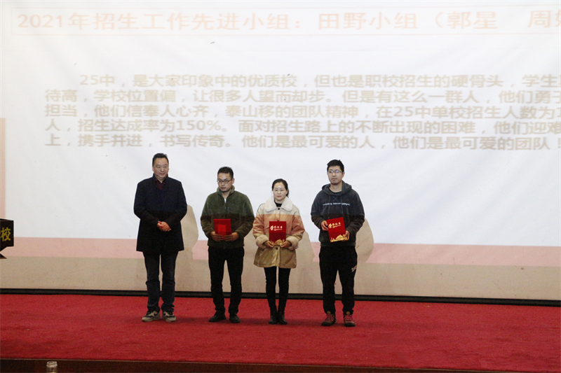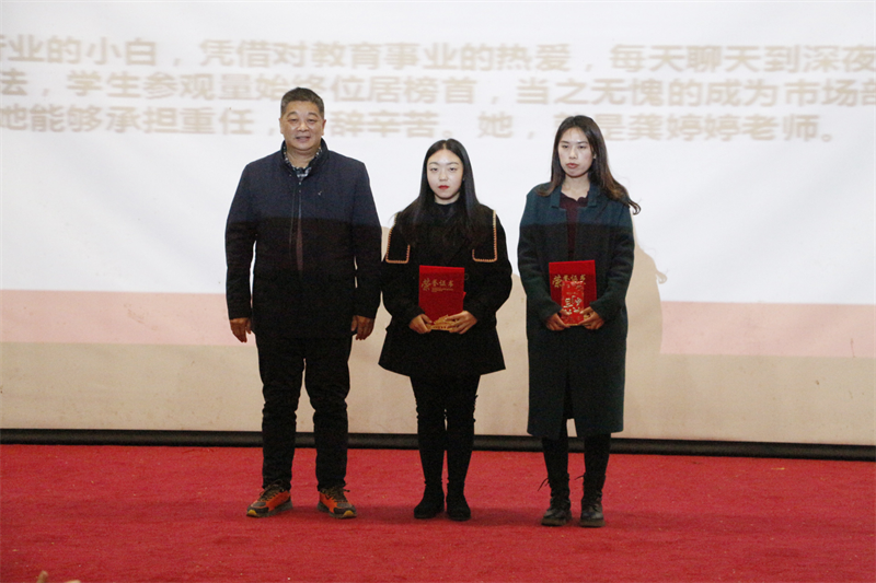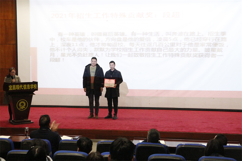 其间,涌现出了一批优秀个体——段超、田野、周媛婷、郭星、龚红艳、龚婷婷等老师。紧锣密鼓的招生工作中,只要有他们的身影,就一定有兢兢业业、任劳任怨的好评,他们没有华丽的语言,没有弄虚作假的宣传,有的是雷厉风行的超强执行力,冲锋在前的战斗意识。事业无止境,奋斗无穷期,正是这些先进招生教师的鲜活写照。涓涓细流,点点积淀,脚踏实地,执着追寻,是他们出类拔萃的秘诀,他们所带领的团队,有一股“人心齐泰山移”的干劲,有一份“敢为天下先”的勇气和魄力。今天,他们在领奖台上熠熠生辉的自信神采,他们在灯光下面若桃李的喜悦笑容,激励着更多的教师向他们看齐。