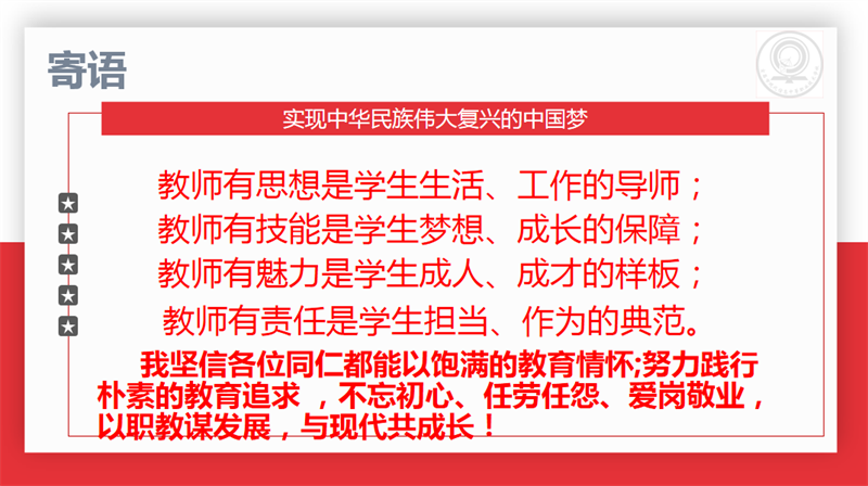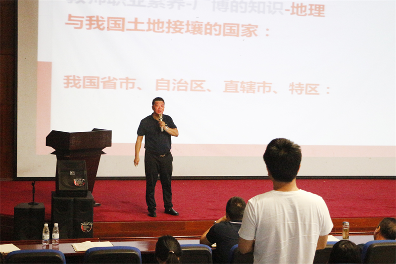 师德铸魂,匠心筑梦。为全面贯彻落实立德树人的根本任务,进一步加强我校教师队伍的师德师风建设,培养教师高尚的道德情操,校长朱宗桥讲解了教师职业素养培训,详细讲解教师职业素养:道德素养、心理素养、知识素养、能力素养,希望现代教师以饱满的教育情怀;努力践行朴素的教育追求,不忘初心、任劳任怨、爱岗敬业,以职教谋发展,与现代共成长,办好人民满意的职业教育!