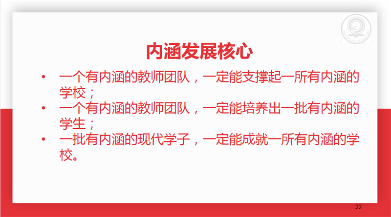 执行校长李朝晖以“乘职教改革春风、走内涵发展之路、育现代信息英才”为题进行学校内涵建设讲座,提出教师队伍建设是内涵发展的基石、立德树人是内涵发展的灵魂、制度管理是内涵发展的保证、课堂教学是内涵发展的阵地、优质服务是内涵发展的保障,指明了内涵建设核心要素,感召现代教师坚持“内涵发展”、全面提升教育教学质量,共创现代美好明天。
