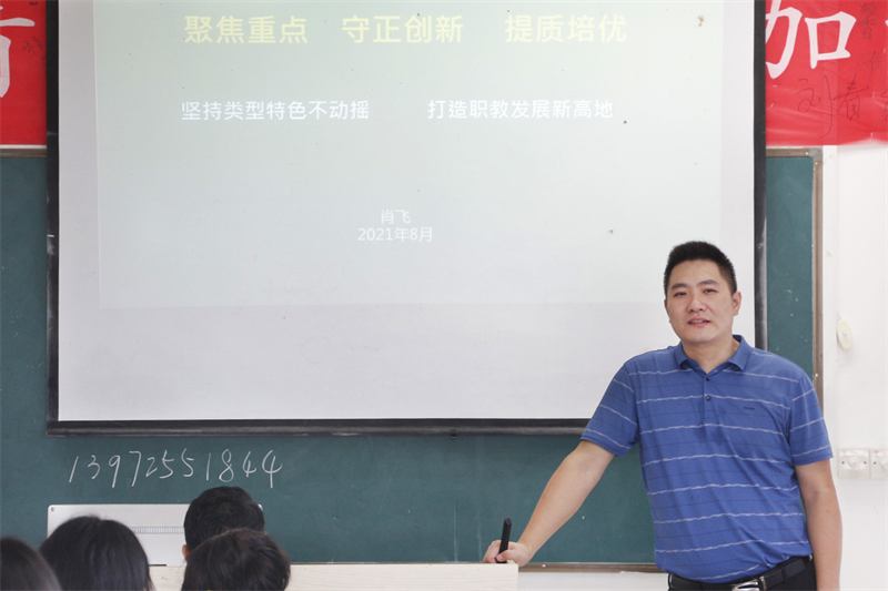 副校长肖飞以“发起职业教育高质量攻坚战”主题,从“把握类型特色、强化职教使命担当”、“聚焦发展重点、狠抓专业内涵建设”、“落实根本任务、做实思想政治教育”三方面进行详细阐述。要求新教师加强教育政策的学习,在教育教学实践中不断探索,全面提高教育教学策略和效果。