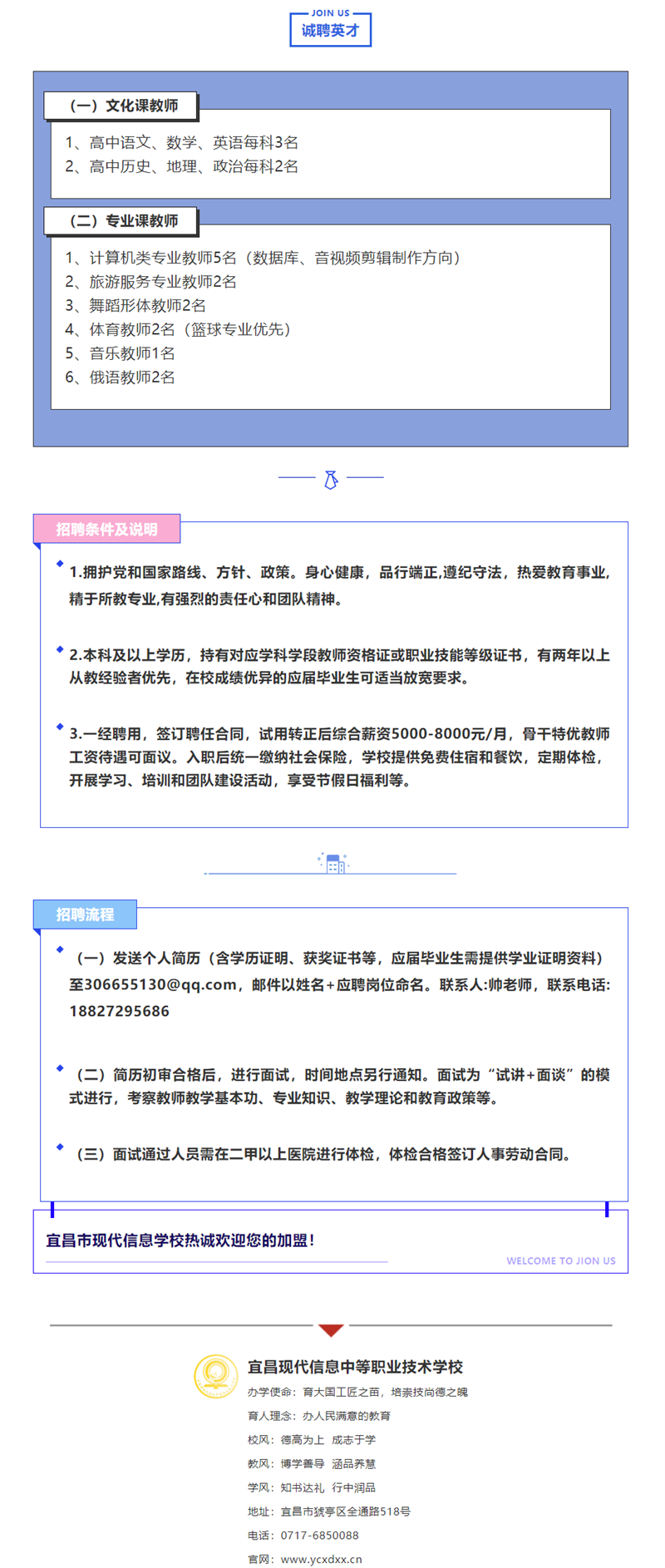 职业教育前景广阔、大有可为。学校21年10月即将交付的新校区距离火车东站两公里,区位优势明显,信息化程度高,将为全校师生提供更为优质的生活、工作、学习的硬件环境。为推动学校内涵发展,加强专业建设,进一步优化学校师资队伍,促进学校教育教学工作更高水平发展,现面向社会诚聘教师。