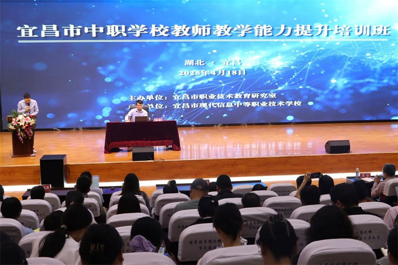 为加强我市职业院校“双师型 ”教师队伍建设,助力职业教育教师专业成长与发展,提升职教整体教育教学质量,2025年4月18日,由宜昌市职业教育研究室主办的"宜昌市中职学校教师教学能力提升培训"在宜昌市现代信息学校圆满举办,本次培训汇集了来自宜昌市14所中职学校的一百六十余名教师参加。宜昌市职教室主任周欣、副主任高清出席本次培训。