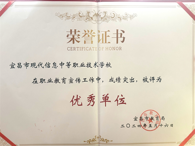 5月16日,在2024年宜昌市职业教育宣传月启动仪式上,宜昌市教育局授予我校“职业院校宣传工作优秀单位”称号,对我校2023年度教育新闻宣传工作进行了表彰。