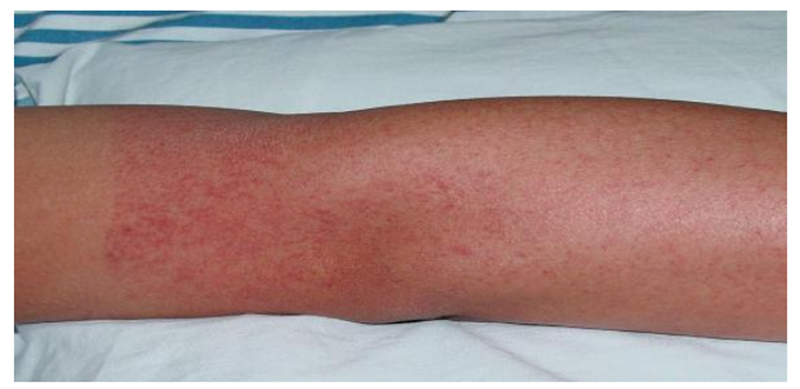 皮疹:四肢躯干或头面部,出现充血性皮疹或点状出血疹。