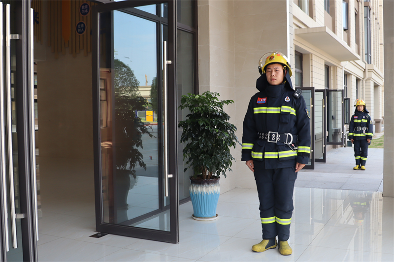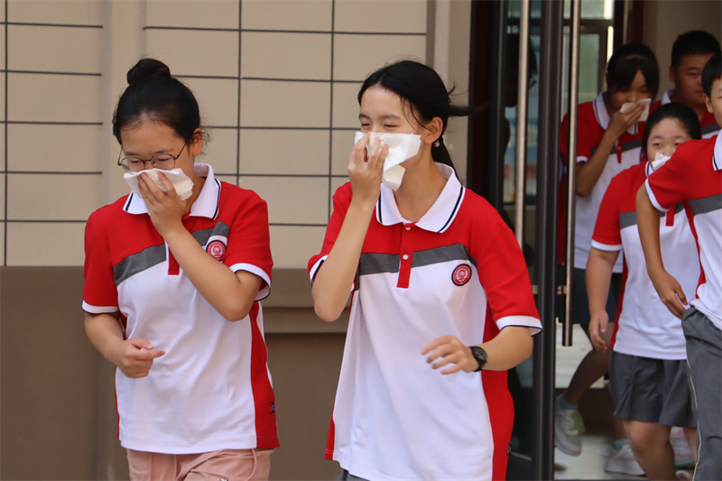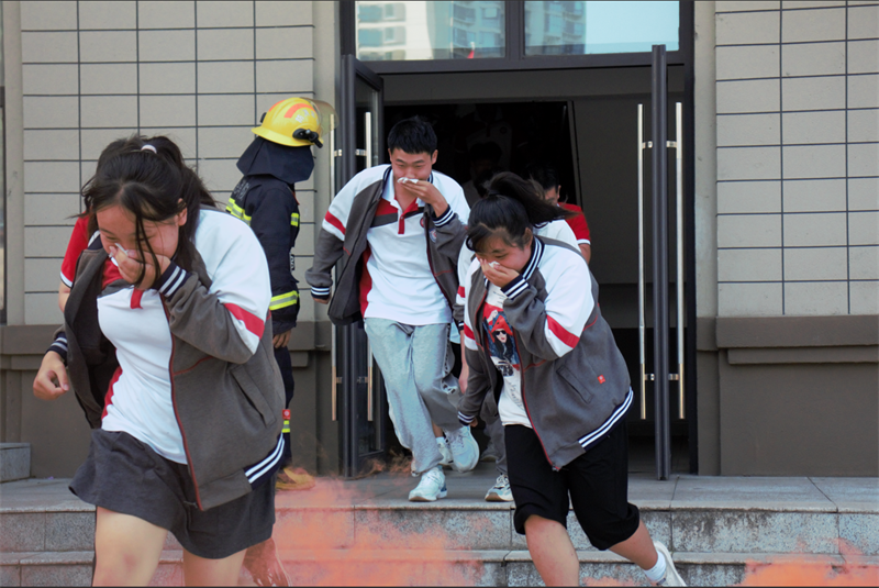 刺耳的警报打破了校园的宁静。教学楼楼梯间浓烟滚滚。各班级按要求从不同楼层撤出,前往指定地点完成疏散。“掩住口鼻、弯腰前行、注意脚下、有序小跑”,一句句坚定有力的口令指导着学生,在教师与教官的引导下,同学们捂住口鼻,有序而快速地撤出楼道。