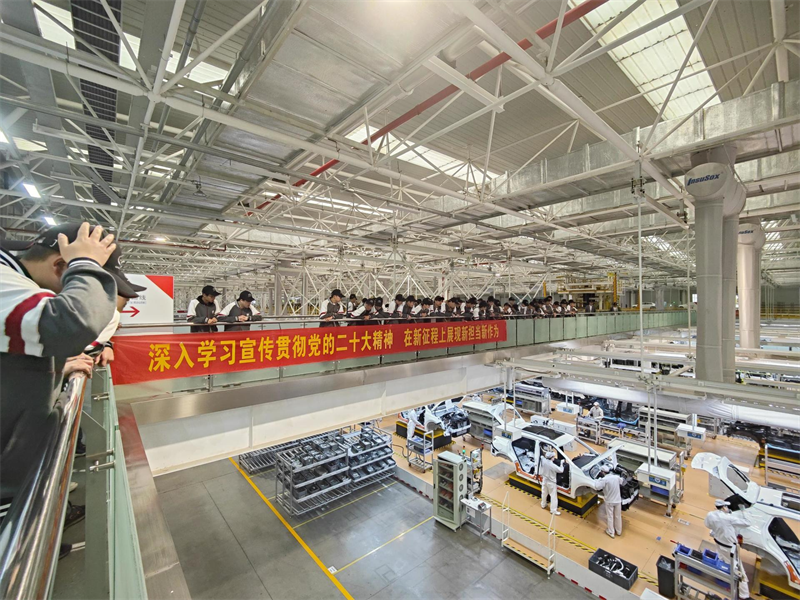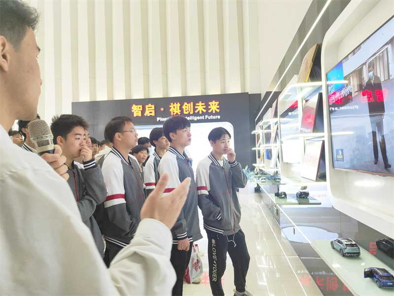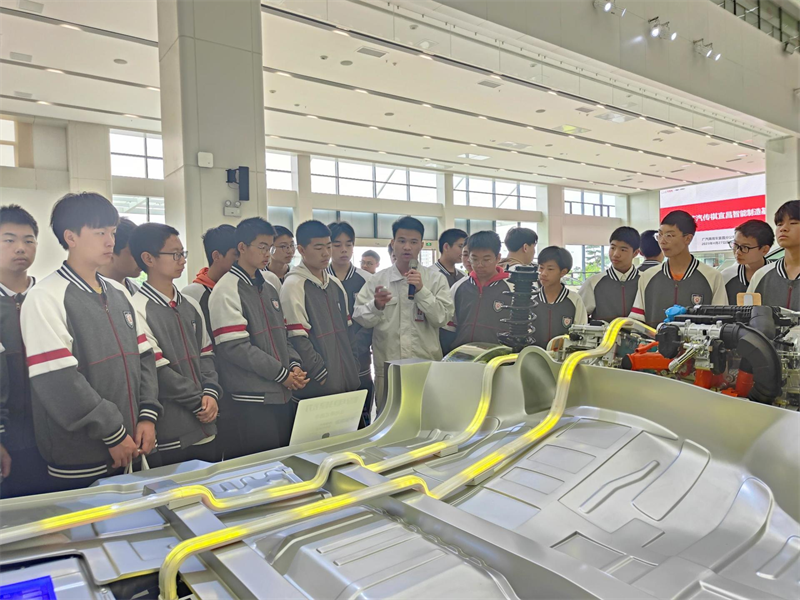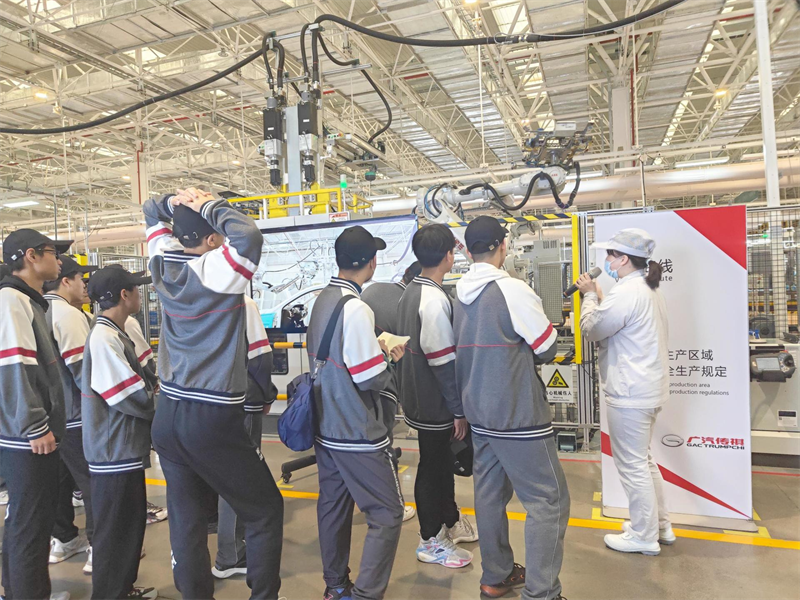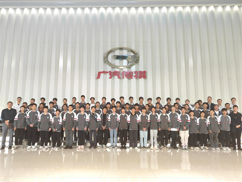 在冲压车间内,同学们认识了利用压力机和模具对板材施加外力,使之产生塑性变形或分离,从而获得所需形状和尺寸的工件,了解其中生产的高效性;走进焊装厂,同学们被焊装机器人所吸引,看到一辆汽车的初始模样,这里的自动化程度高,它将以钢材为主的车身部件通过焊接的方法组装成白车身;在涂装车间, 同学们看到将涂料覆盖在经过处理的车身表面,改善车身外观,提高车身耐腐蚀性,从而提高汽车使用价值;后一步是总装车间,这里是每一辆广汽传祺汽车出产的后一道生产线,采用AGV等自动化工具,将汽车的总成部件进行配送、装配、车身运输以及整车下线检测,大大提高生产效率,节省劳动成本。看到车间整车组装的繁忙场景,同学们深刻感受到了各种高科技的人工智能的力量,了解到更多公司自主研发的先进技术。