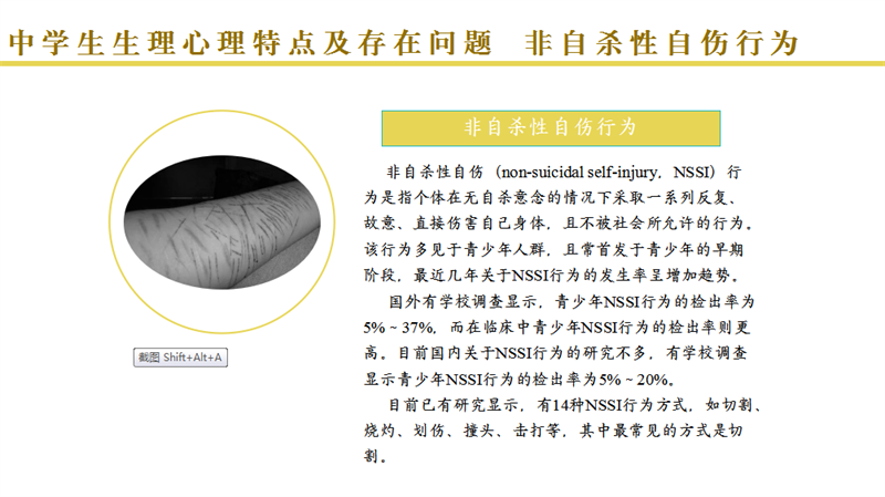 张少龙具体从“厌学”“早恋”“抑郁症”“校园欺凌”“非自杀性自伤行为”五大主要问题进行讲解,做了全面辅导,培育了学生乐观心理品质、自觉维护心理健康,掌握正确应对学业、人际关系等方面不良情绪和心理压力的能力。
