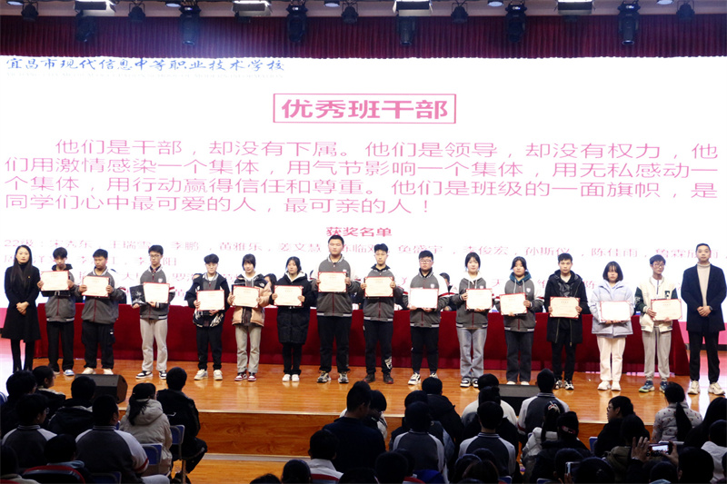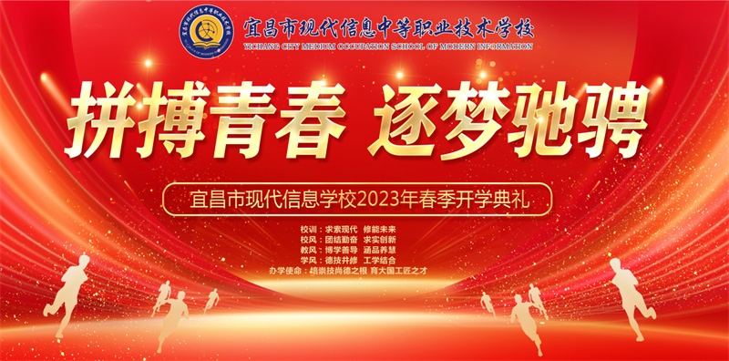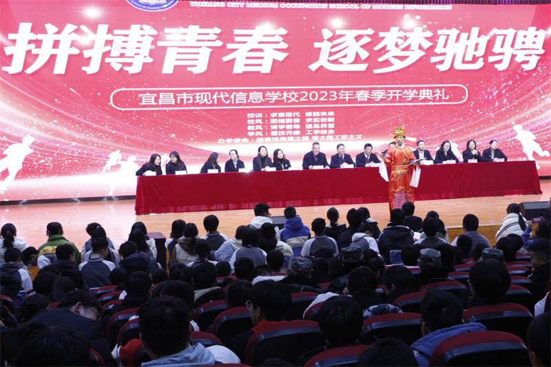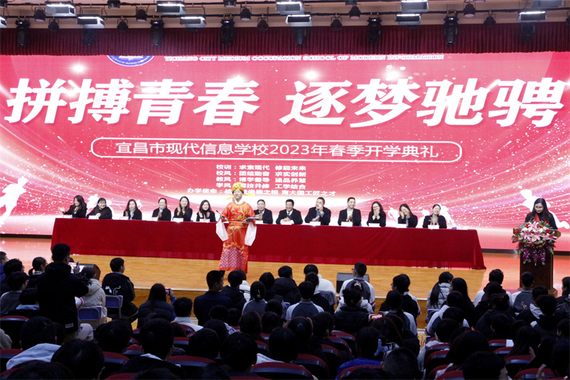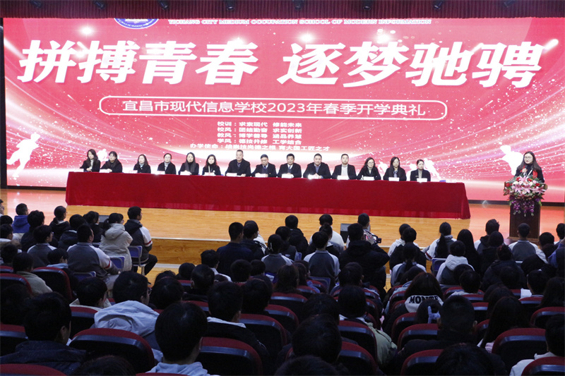 玉兔欢跃迎春来,百尺竿头又一春。宜昌市现代信息学校2023年春季学期开学典礼在全体师生翘首以盼的目光中如期而至,现代教育集团董事长田水荣、副董事长朱宗桥、校长李朝晖、副校长肖飞、事业发展部部长吴可、副部长刘春红及学校各处室负责同志在主席台就坐。