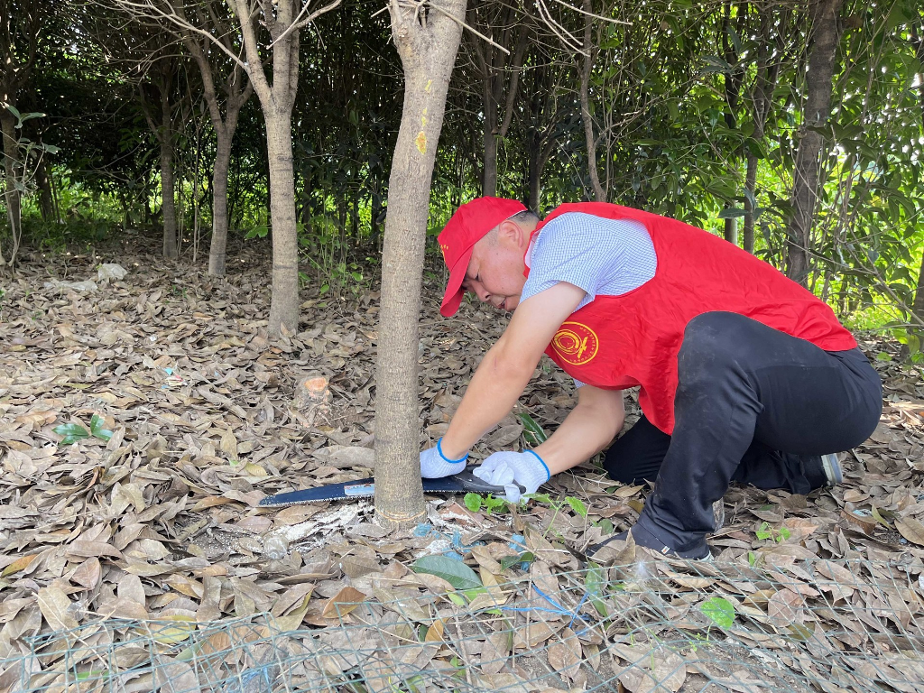 随后,在马书记的带领下,我校师生到达村民家中,给他送去了书包、笔记本、铅笔、绘本、食用油等物品,捐助现金2000元。由于腿脚不便,田间荒草疏于打理,门前杂树交错,段超、周亚姗带领张科松、郑俊豪等同学迅速投入到劳作中去,为村民清理门前桂树,田书记也展现出了党支部带头人的劳动本色,拿起锯子、撸起袖子就带着同学们一起干起来。田书记在劳作的过程中不忘交给孩子们锯树的专业要领。