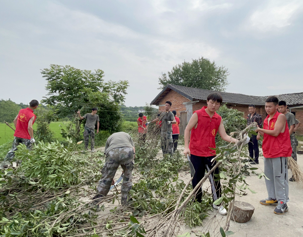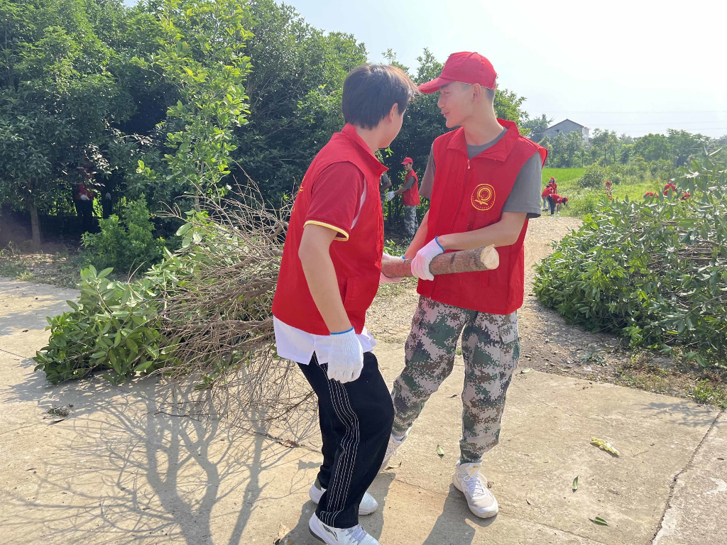 尽管蒸腾的暑气熏红了老师和学生们的脸颊,毒辣的日头汗湿了大家的衣裳,没有人叫苦,没有人喊累。在家是父母心头肉、在校是老师掌中宝的学生们离开了家和校园,也能独当一面,在帮扶劳动中,为了贡献自己的一份力量都卯足了干劲。上午共砍杂树五十多棵,下午又一一将树木剁块清理成柴火,有序整理,码放整齐。