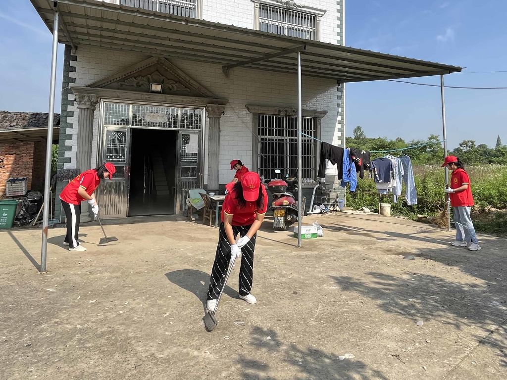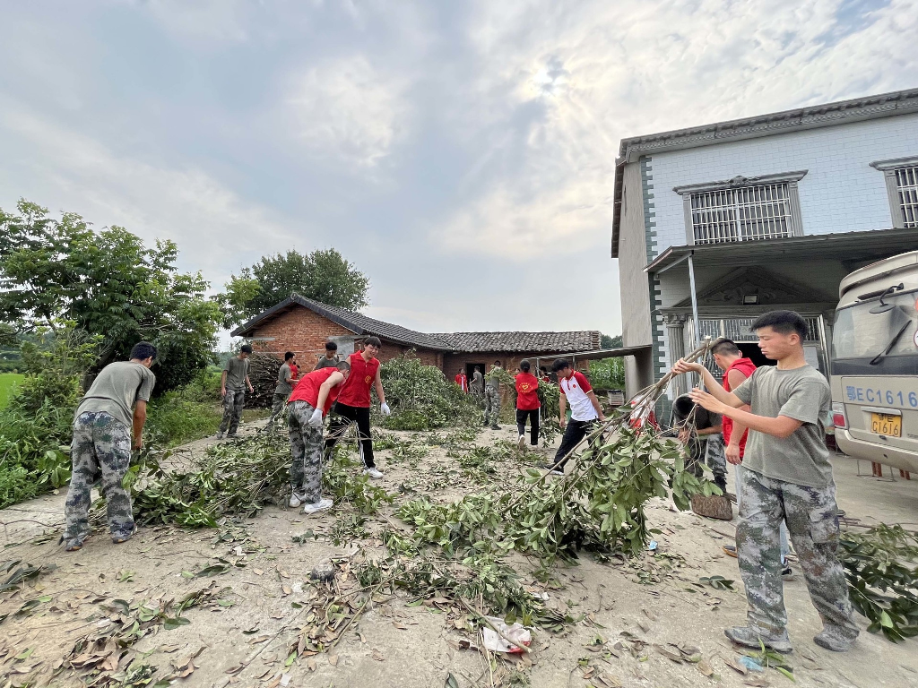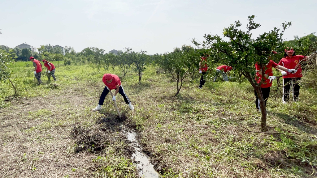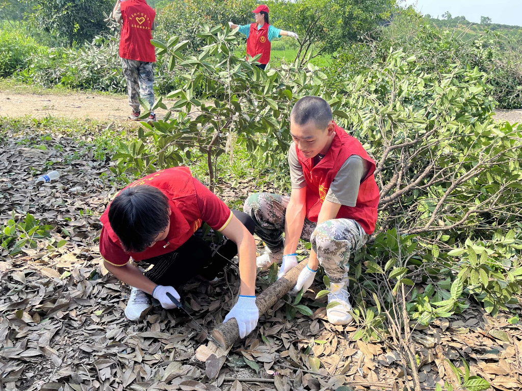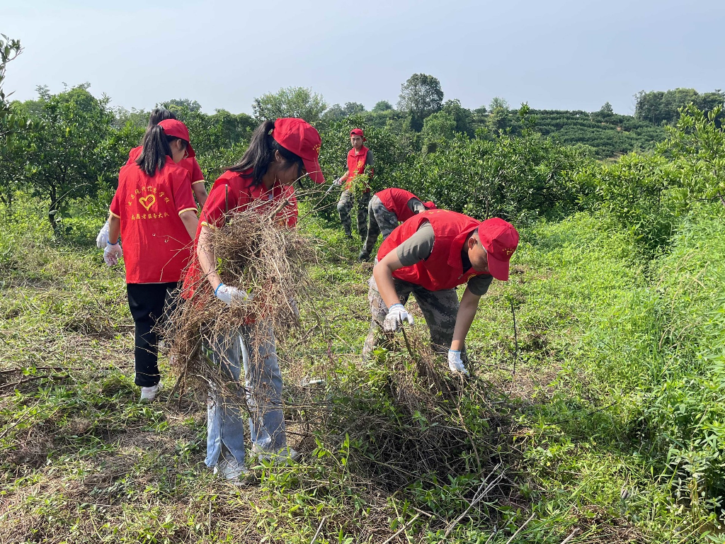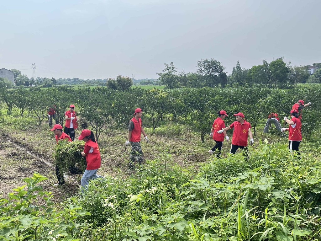 段超老师负责带领男同学清理杂树,席祖萍老师带领部分女生收拾整理房屋及四周的卫生工作,陈喆老师带领部分学生清理田间柑橘树下交错纵横的杂草,疏通水渠,通过一整天的辛勤劳作还田园一派亮丽风景。