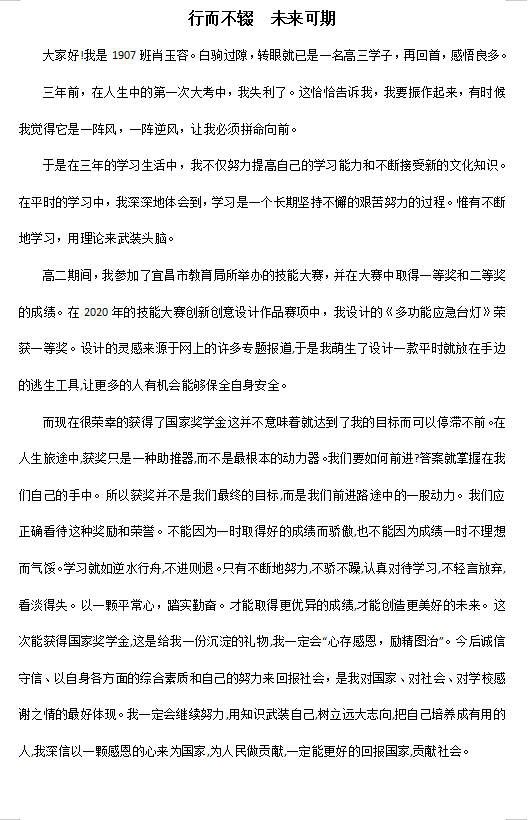 “在好的年华不要辜负好的自己。”三年的高中学习中,肖玉容同学稳扎稳打,不断学习,用理论来武装头脑,丰富完善自己的知识结构,坚持不懈地付出,灵活运用知识解决问题,在锤炼中取得进步,获得学校师生的一致好评。成功不是偶然,是努力后的必然。