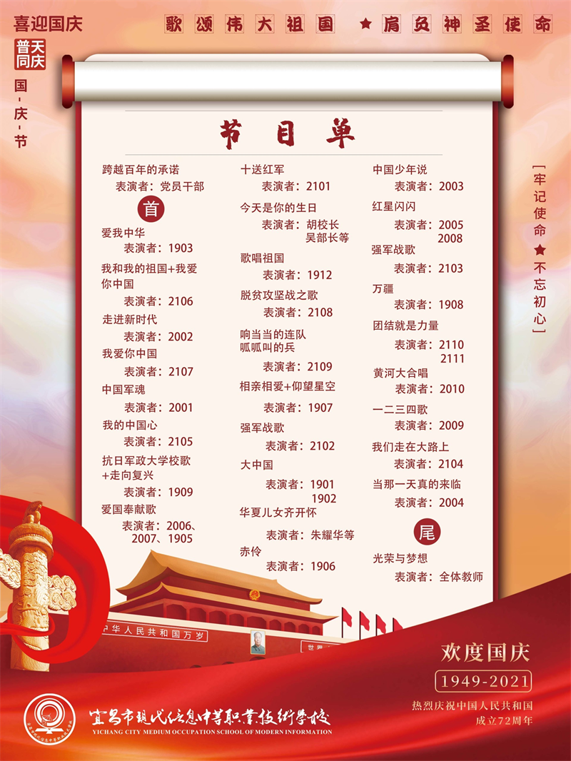 比赛结束,昂扬的语调,铿锵的旋律,仍在校园回荡;同学们坚毅动情的面庞,整齐划一的队列,一一在眼前闪现。数个日夜的训练,不惧苦,不怕累,才有了此时此刻精彩的演出。那些流淌的汗水,饱含的热泪,无不诉说着爱我中华的喜悦自豪之情。72周年华诞,祝福却不止72次,每时每刻都愿祖国繁荣昌盛,河山永壮美!
