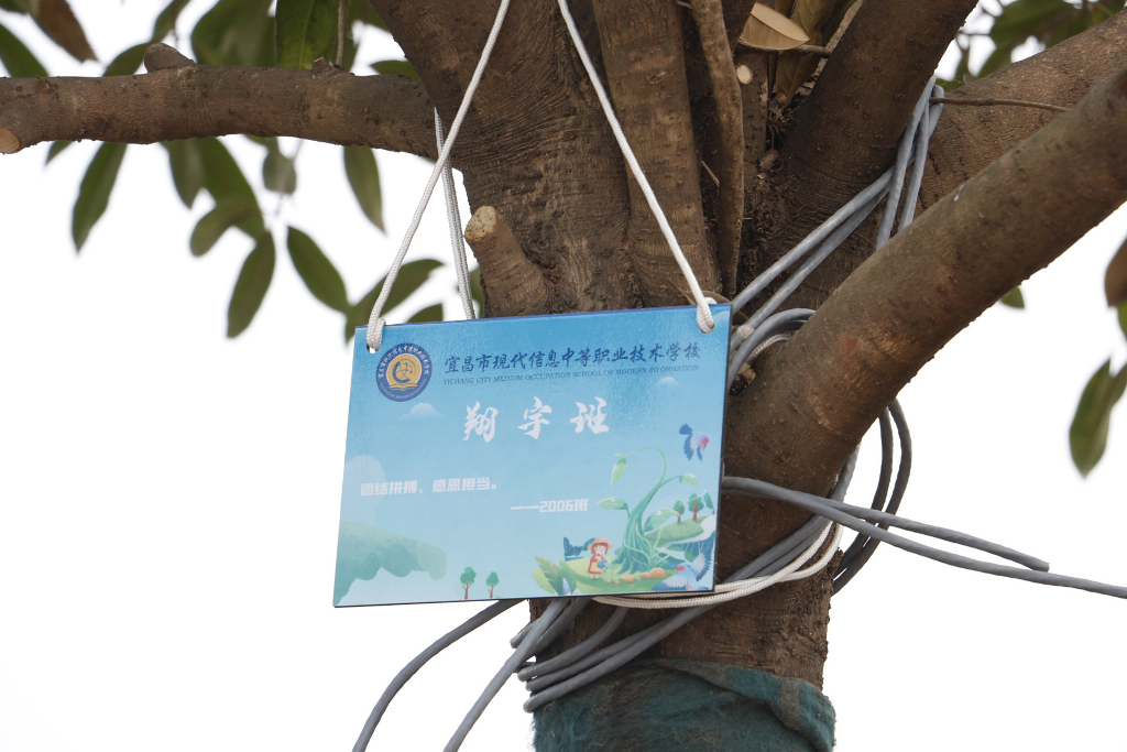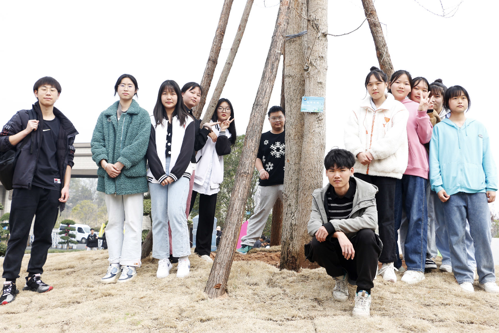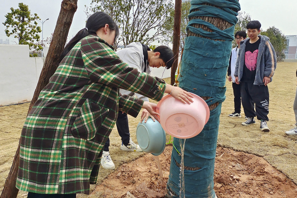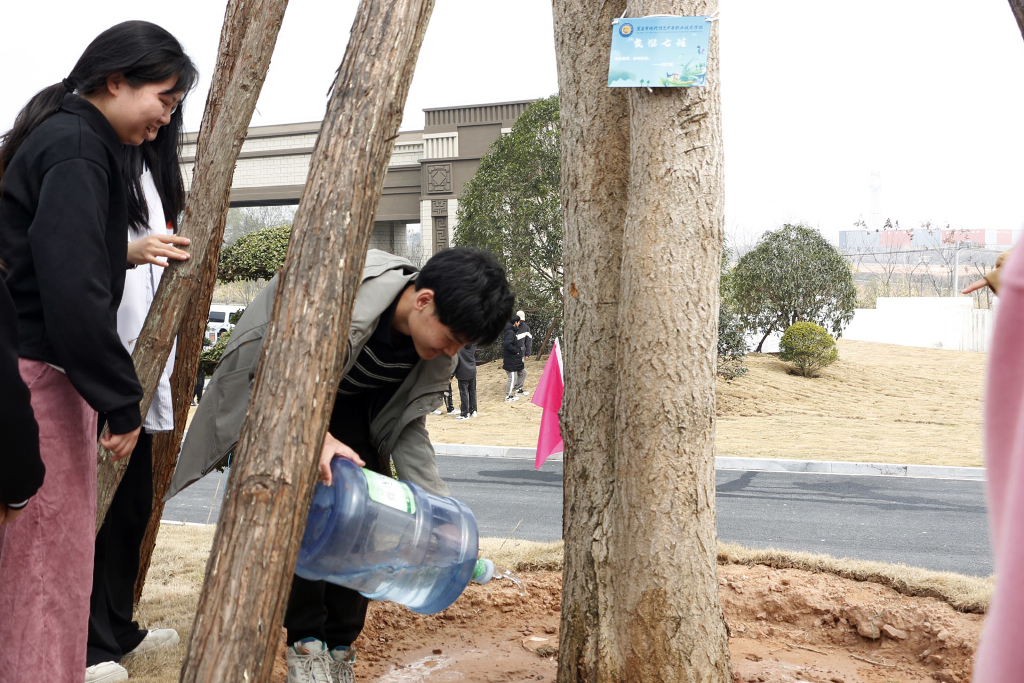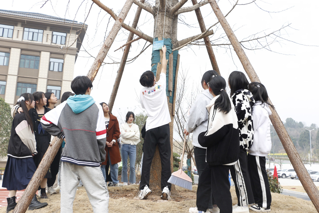 活动现场,各班同学环抱本班认领的树木,认真听取养护方式的讲解,蹲在大树前合影留念。株株翠绿舒展,与大家的笑容相映成辉。由师生共同挂上班级铭牌,绕树洒水,颇具仪式感。