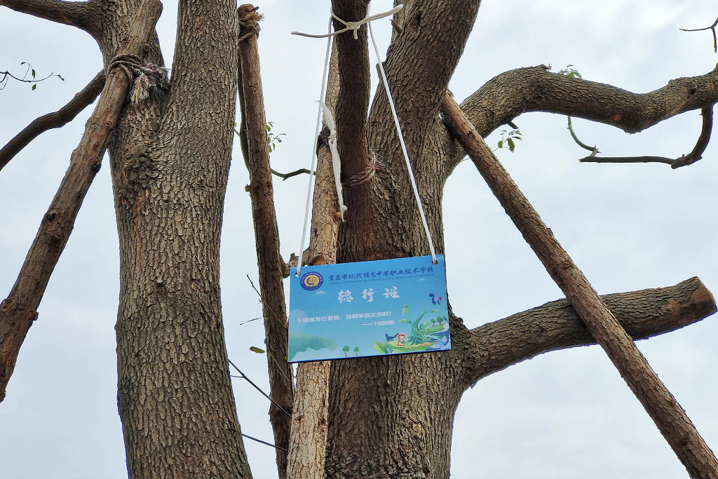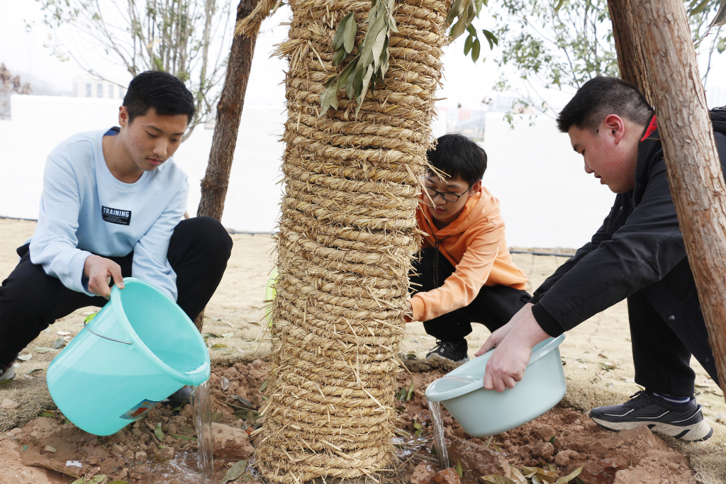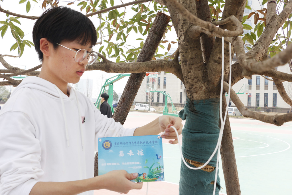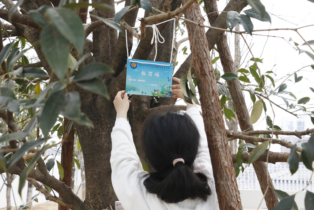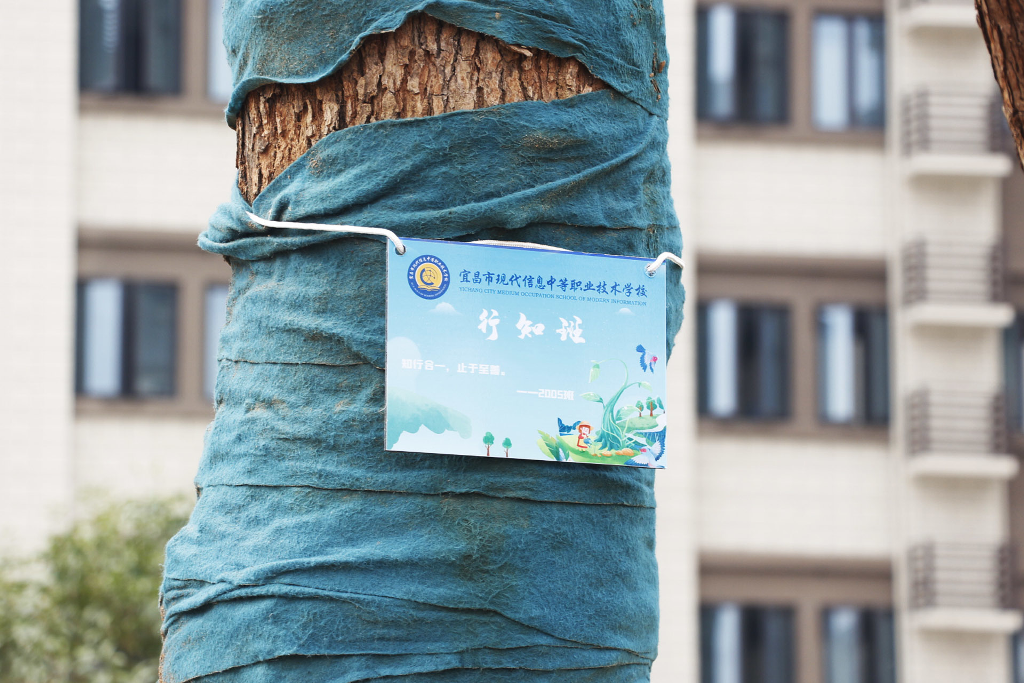 活动现场,各班同学环抱本班认领的树木,认真听取养护方式的讲解,蹲在大树前合影留念。株株翠绿舒展,与大家的笑容相映成辉。由师生共同挂上班级铭牌,绕树洒水,颇具仪式感。